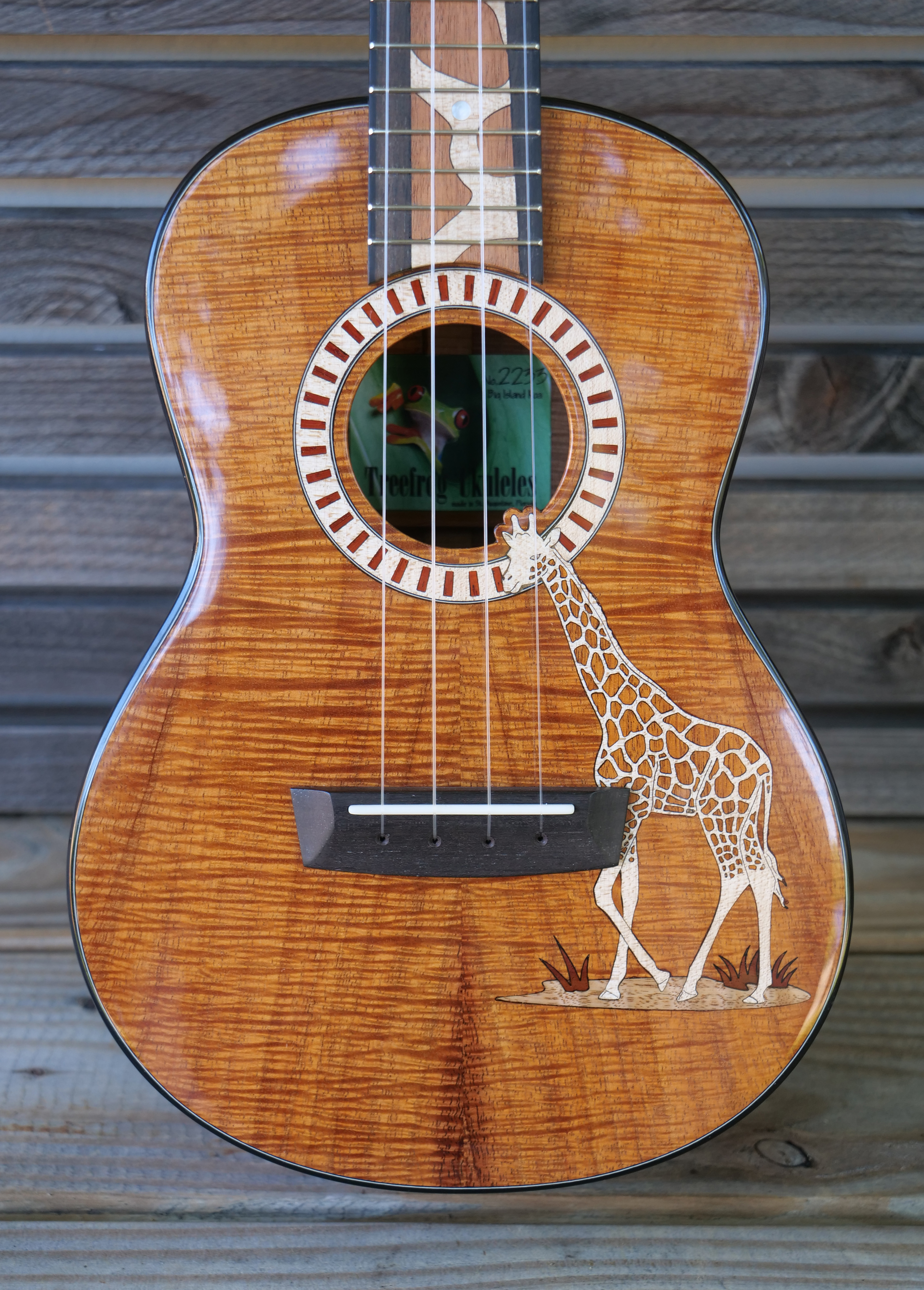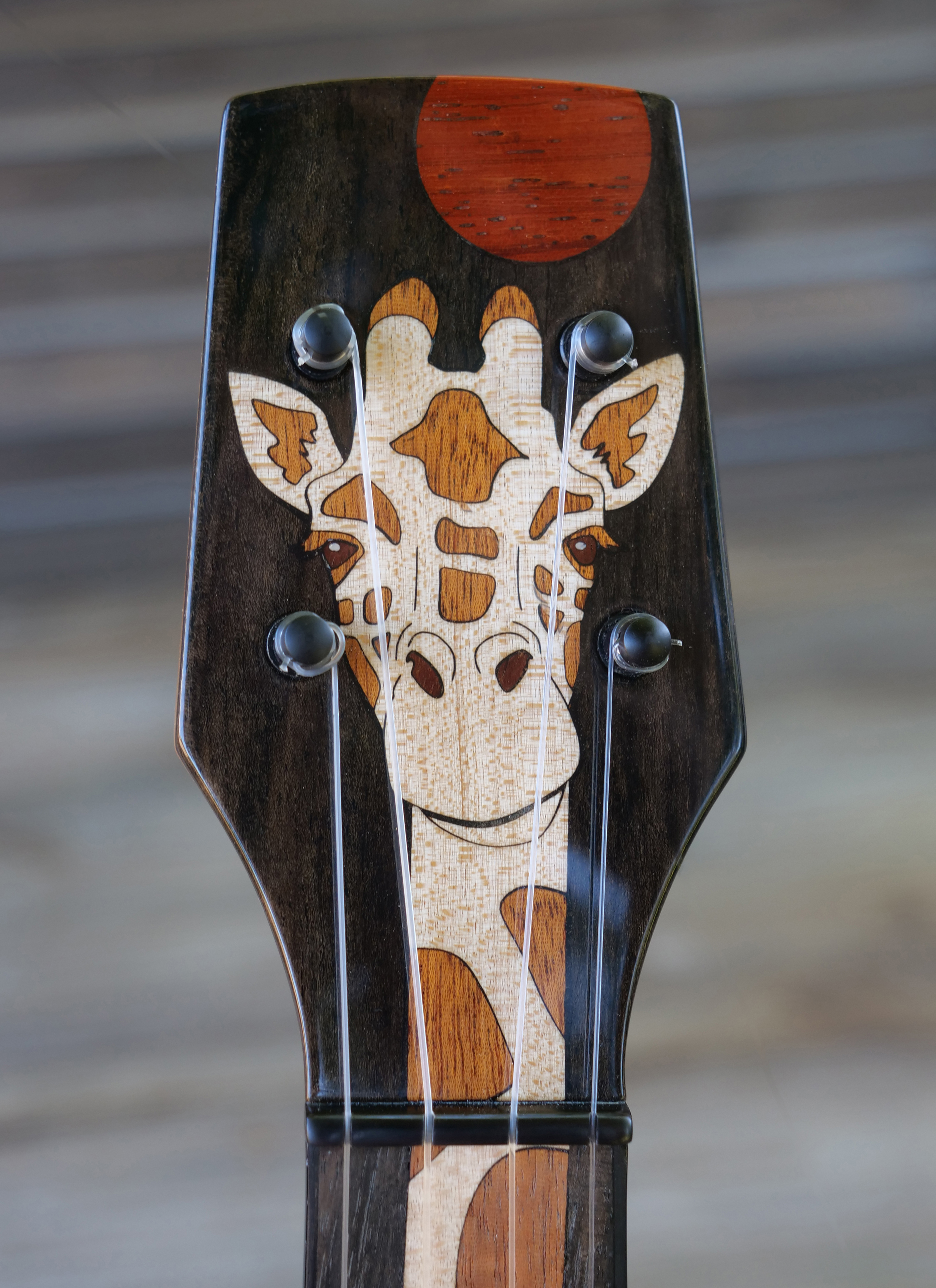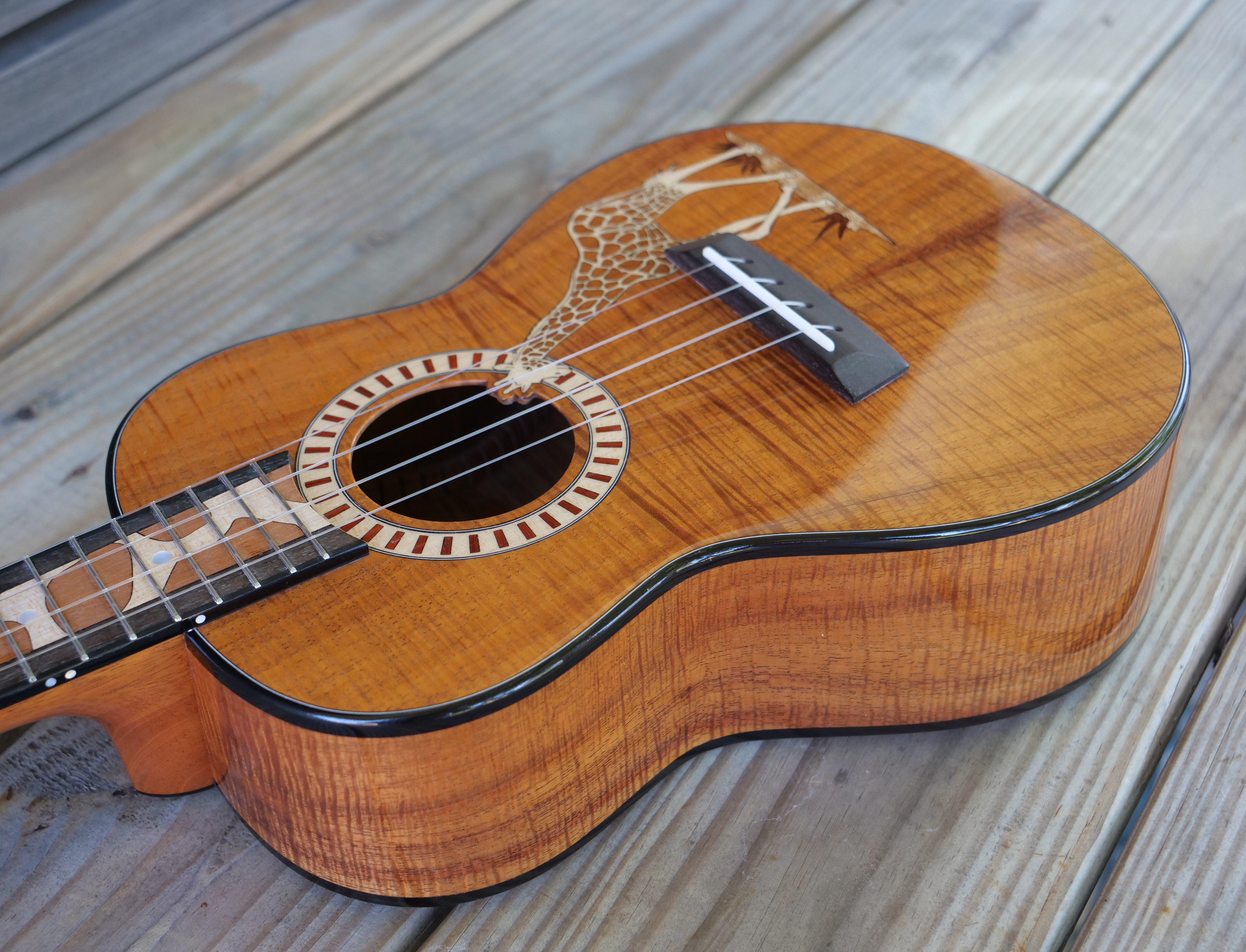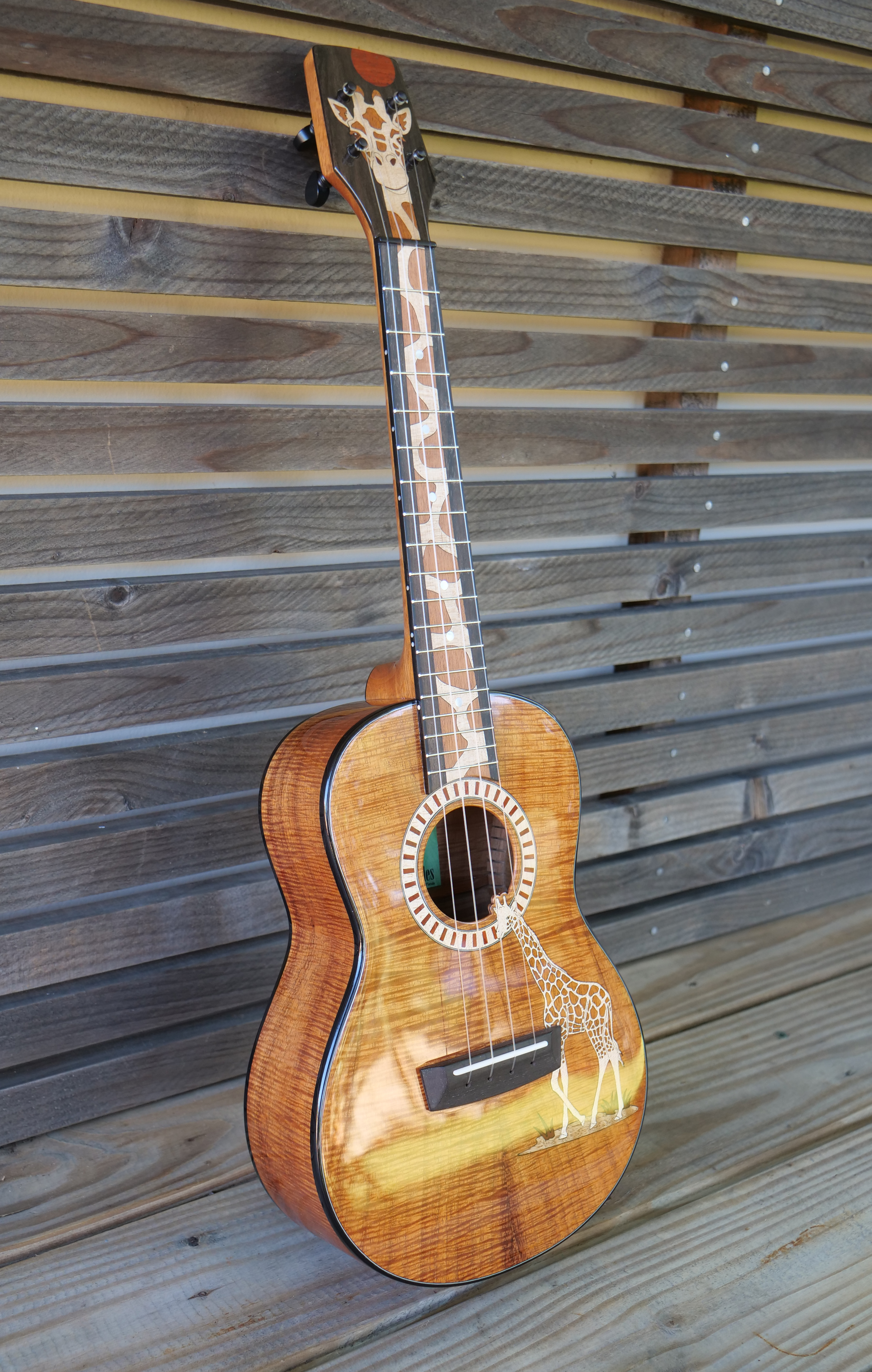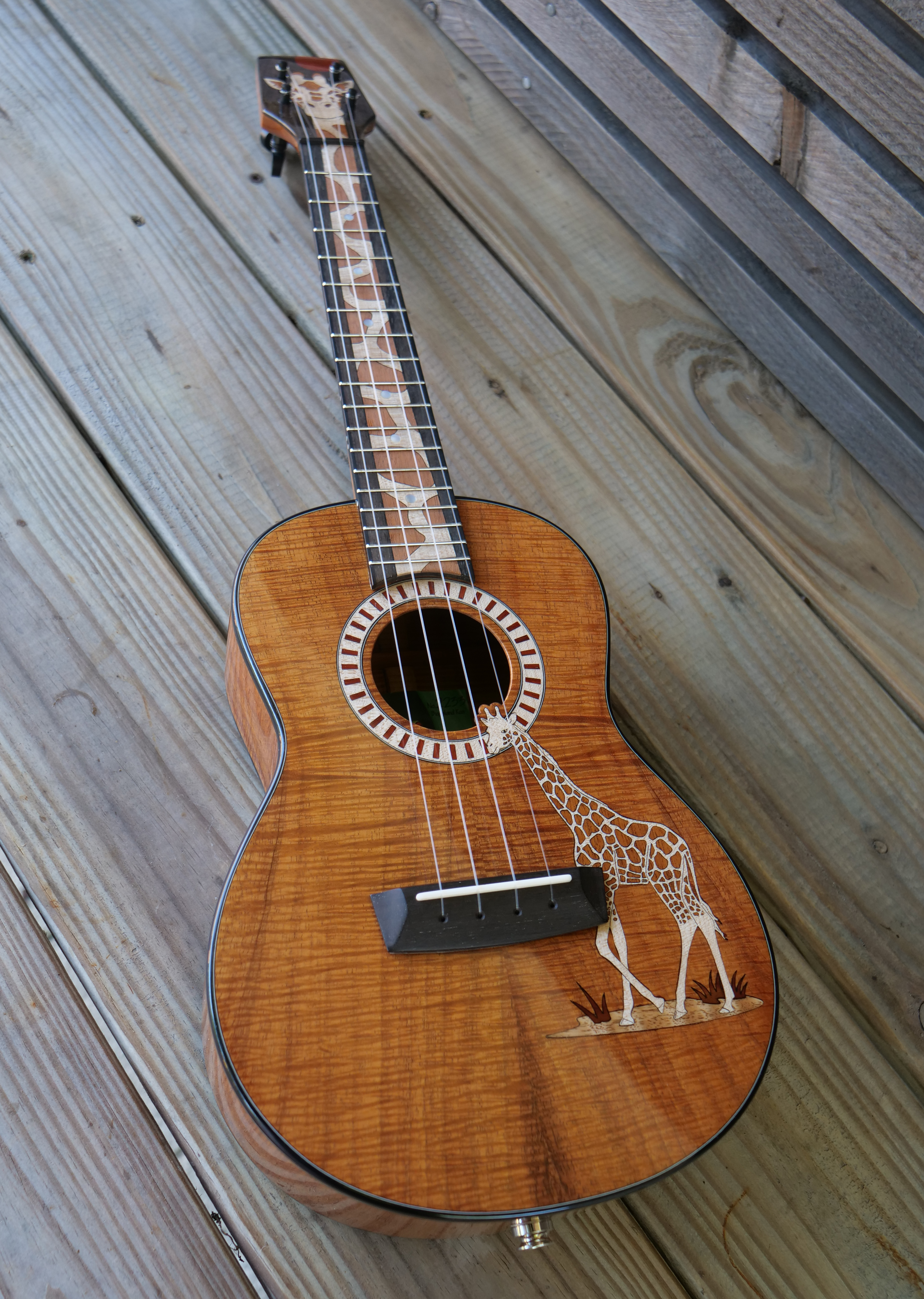 The owner of this beautiful Koa tenor ukulele is a fan of the giraffe, maybe the perfect subject for an inlay on a long tenor fretboard. Inlays and rosette are Maple, Mahogany, Padauk and Oak and Myrtle.