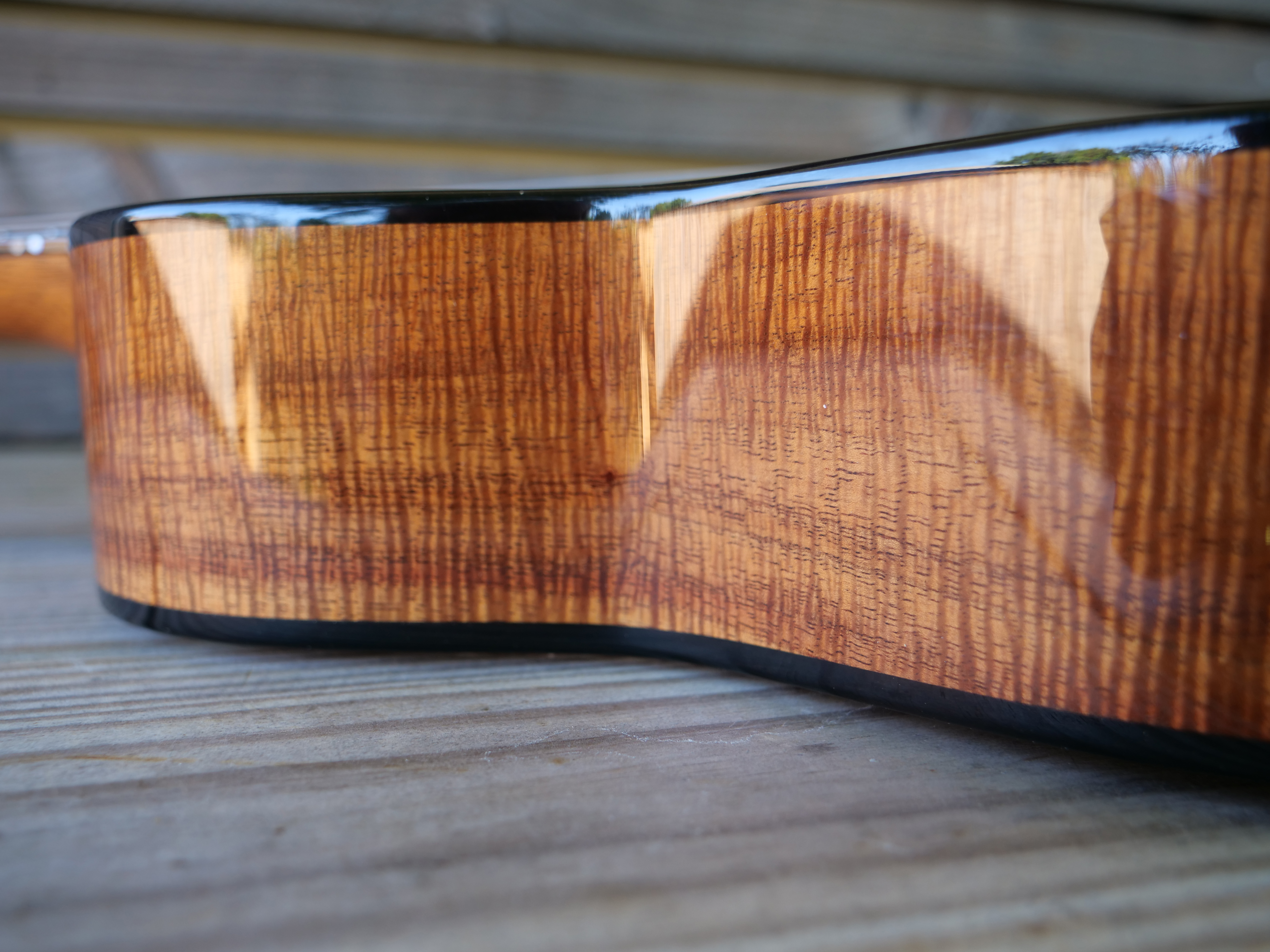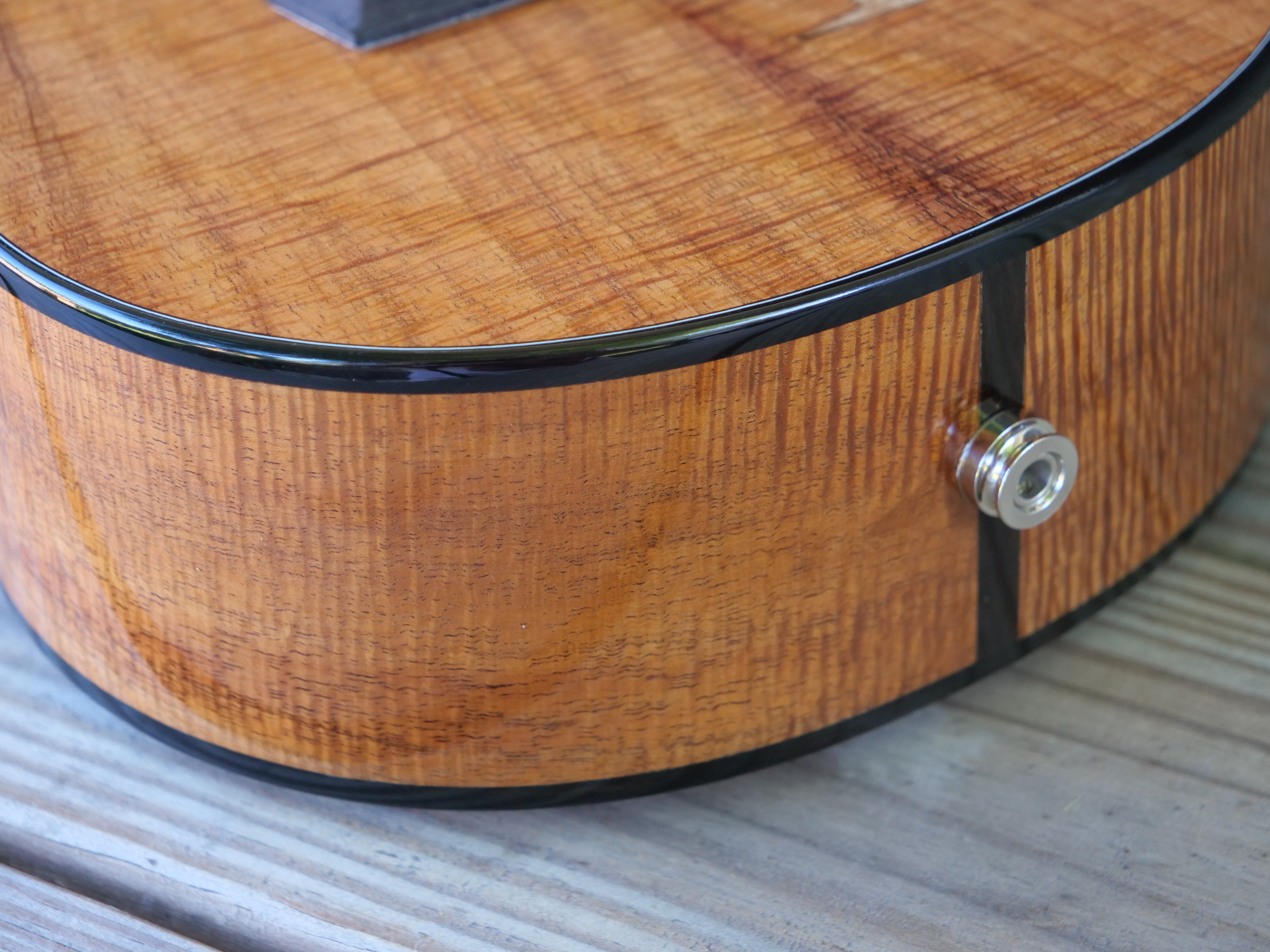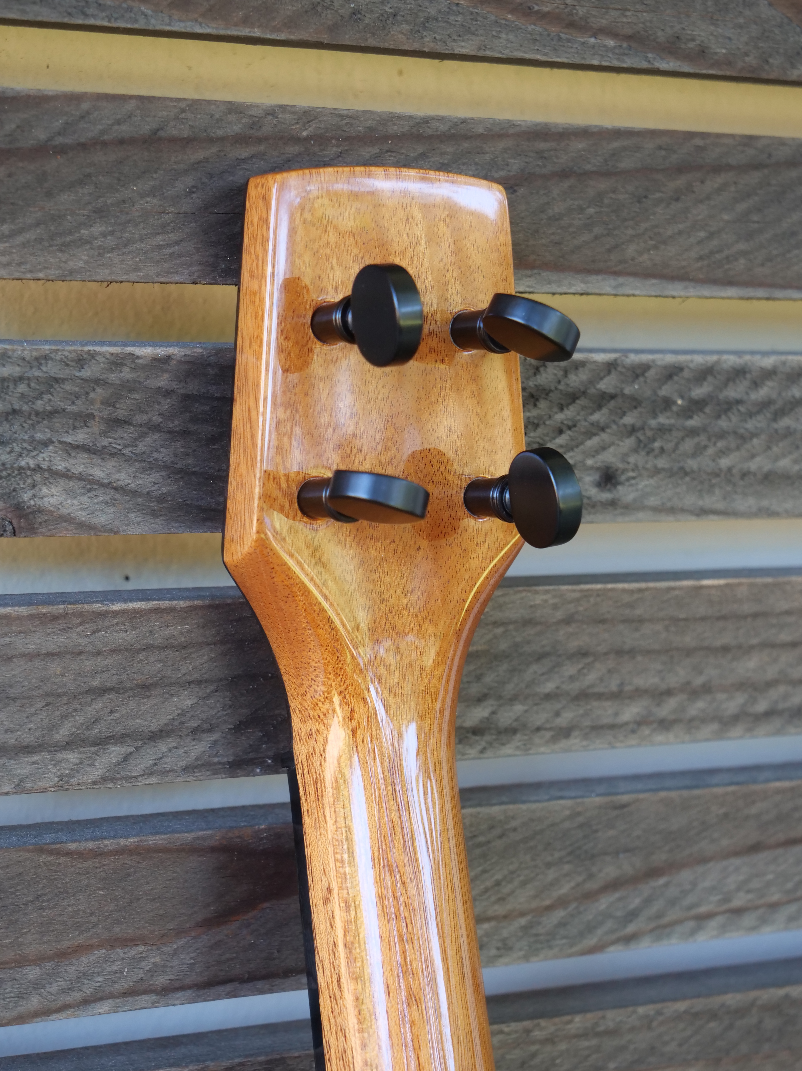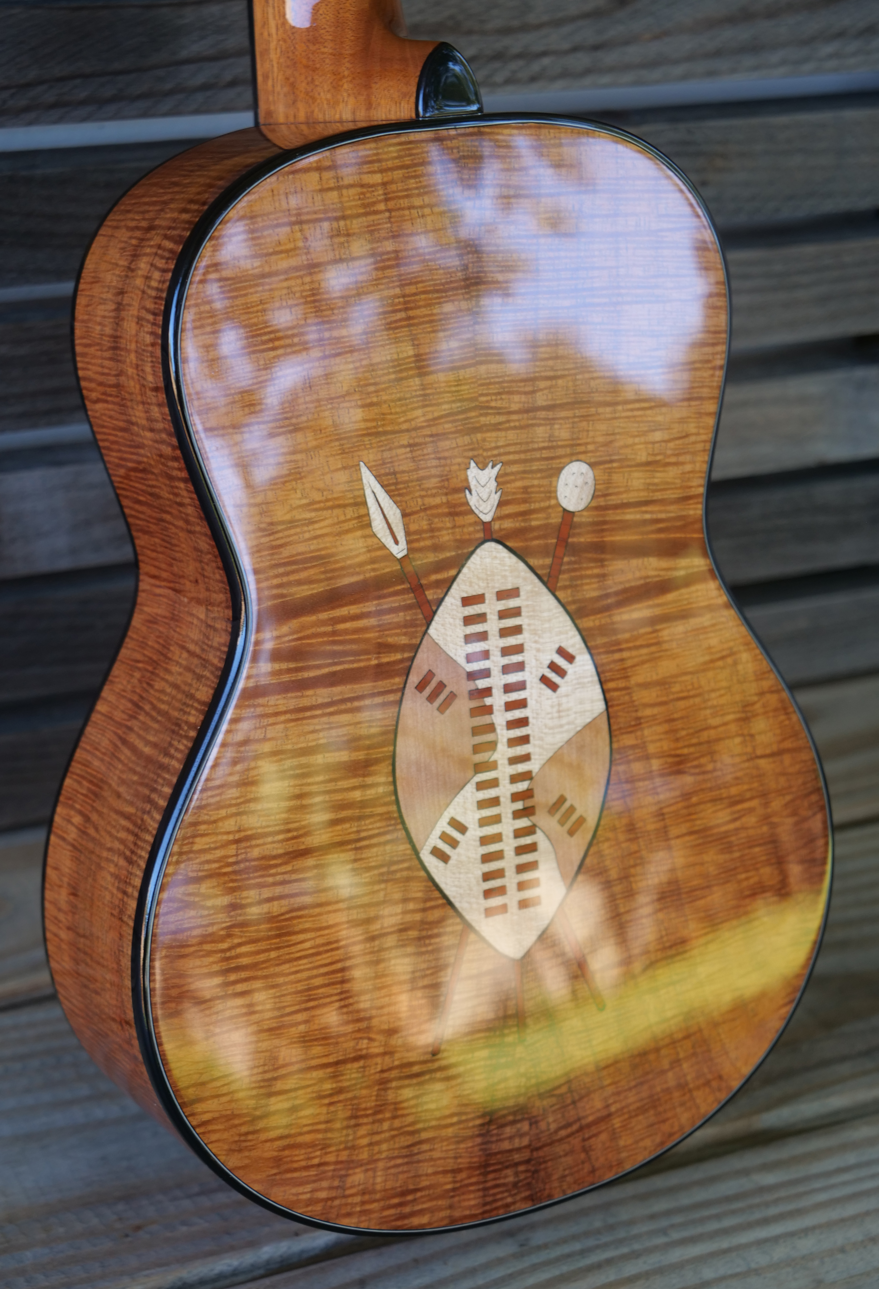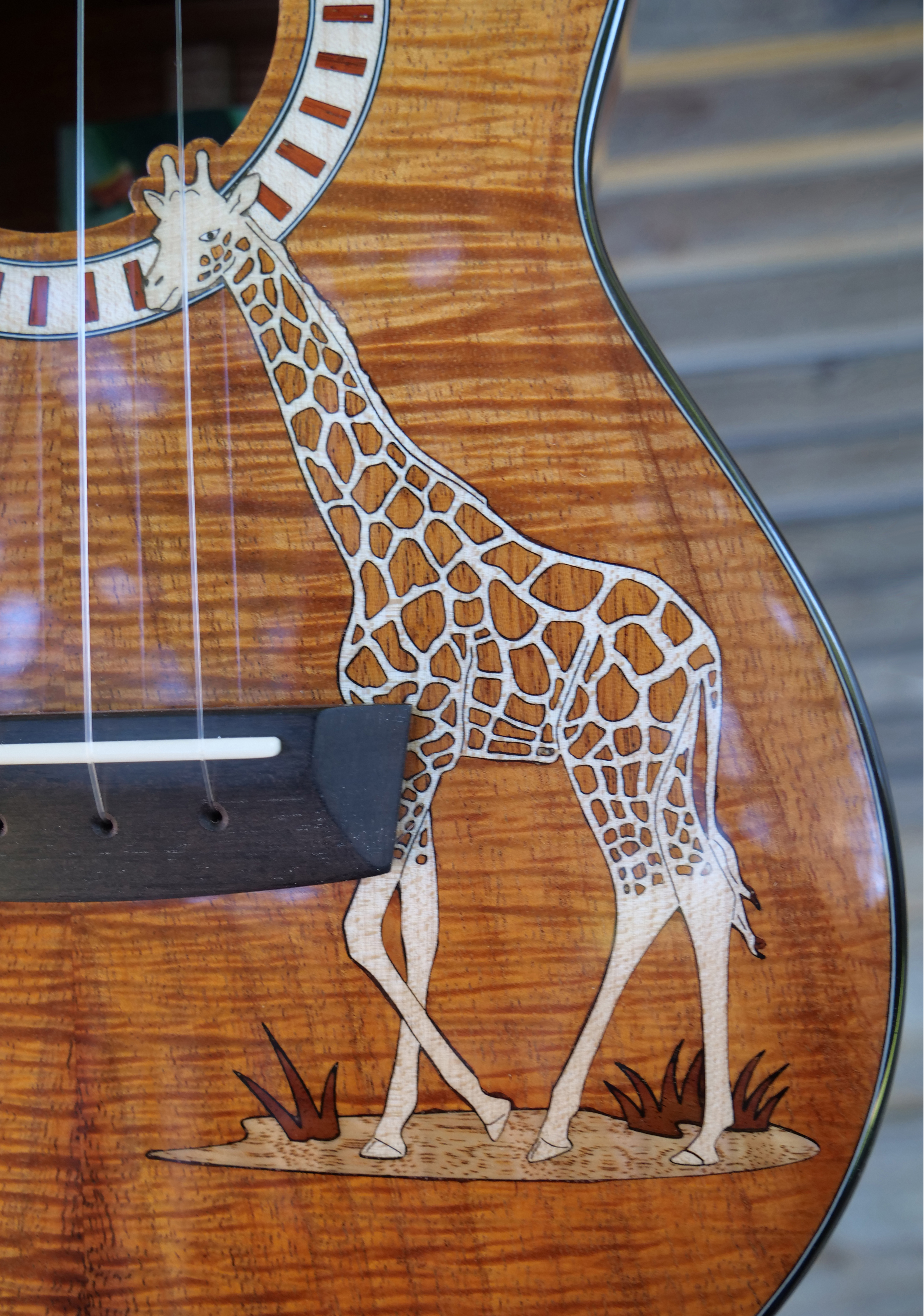 The owner of this beautiful Koa tenor ukulele is a fan of the giraffe, maybe the perfect subject for an inlay on a long tenor fretboard. Inlays and rosette are Maple, Mahogany, Padauk and Oak and Myrtle.