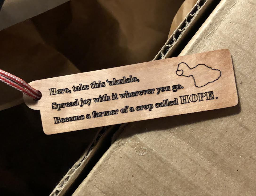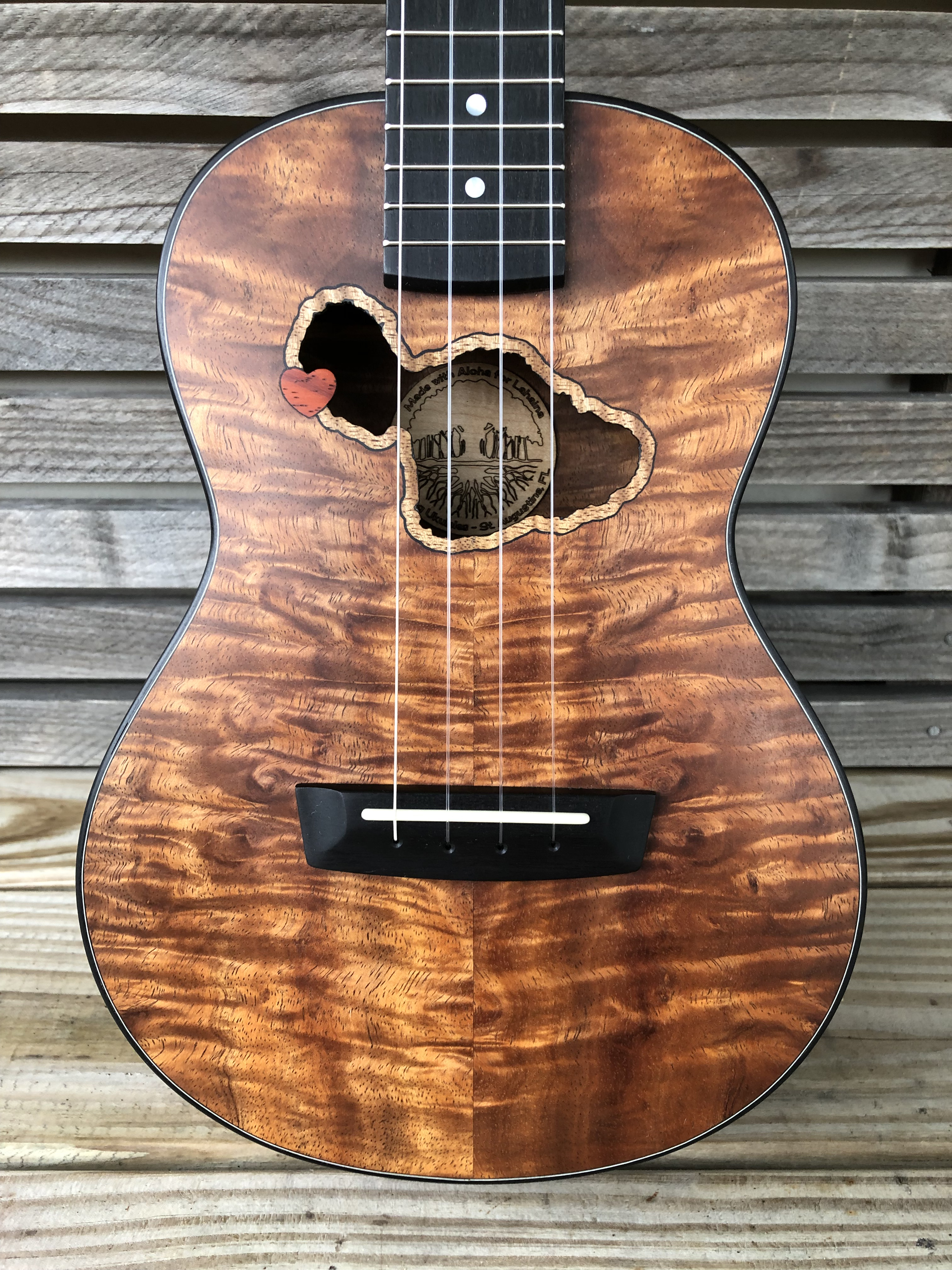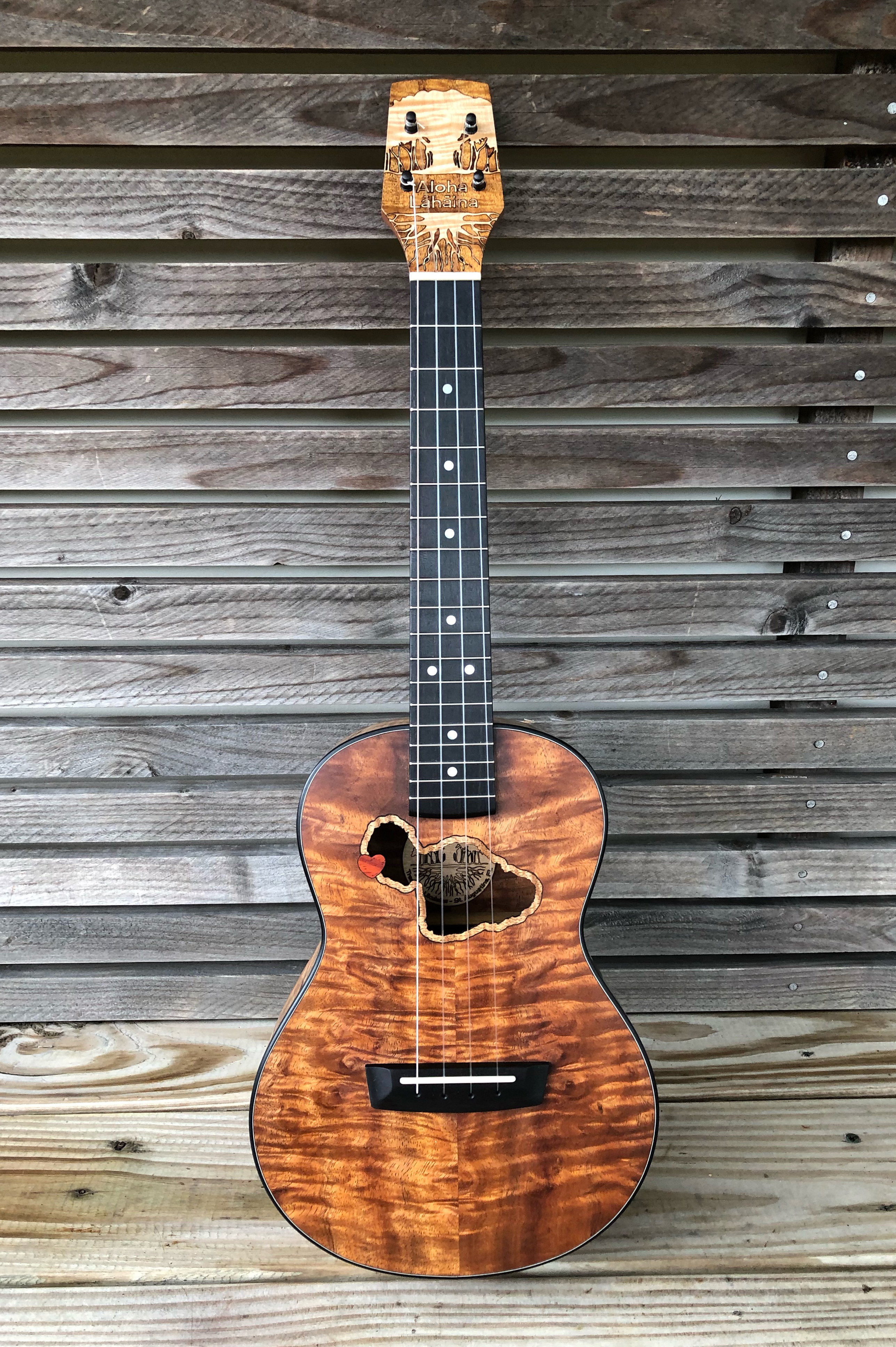This tenor ‘ukulele, made from beautiful quilted Koa, is meant to try to bring a little joy to the lives of some devastated by the August 8 firestorm that destroyed the wonderful town of Lahaiana, on the island of Maui.
