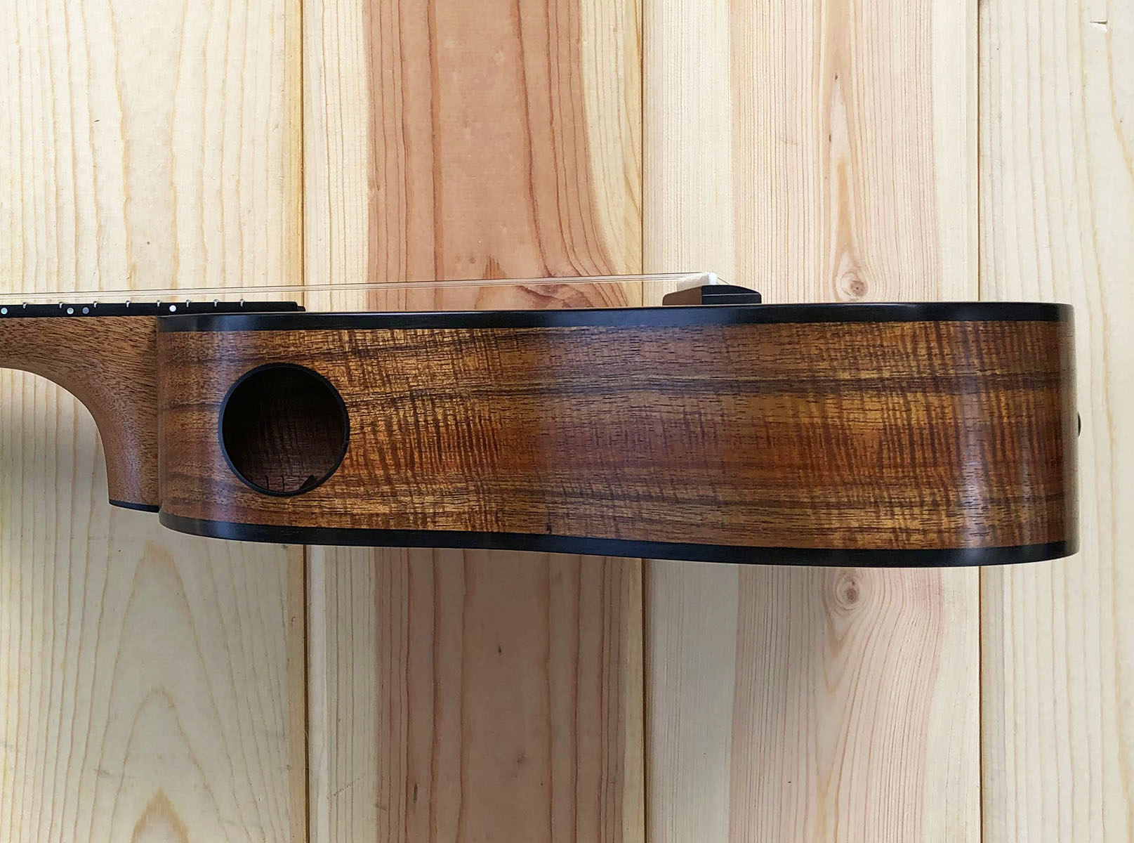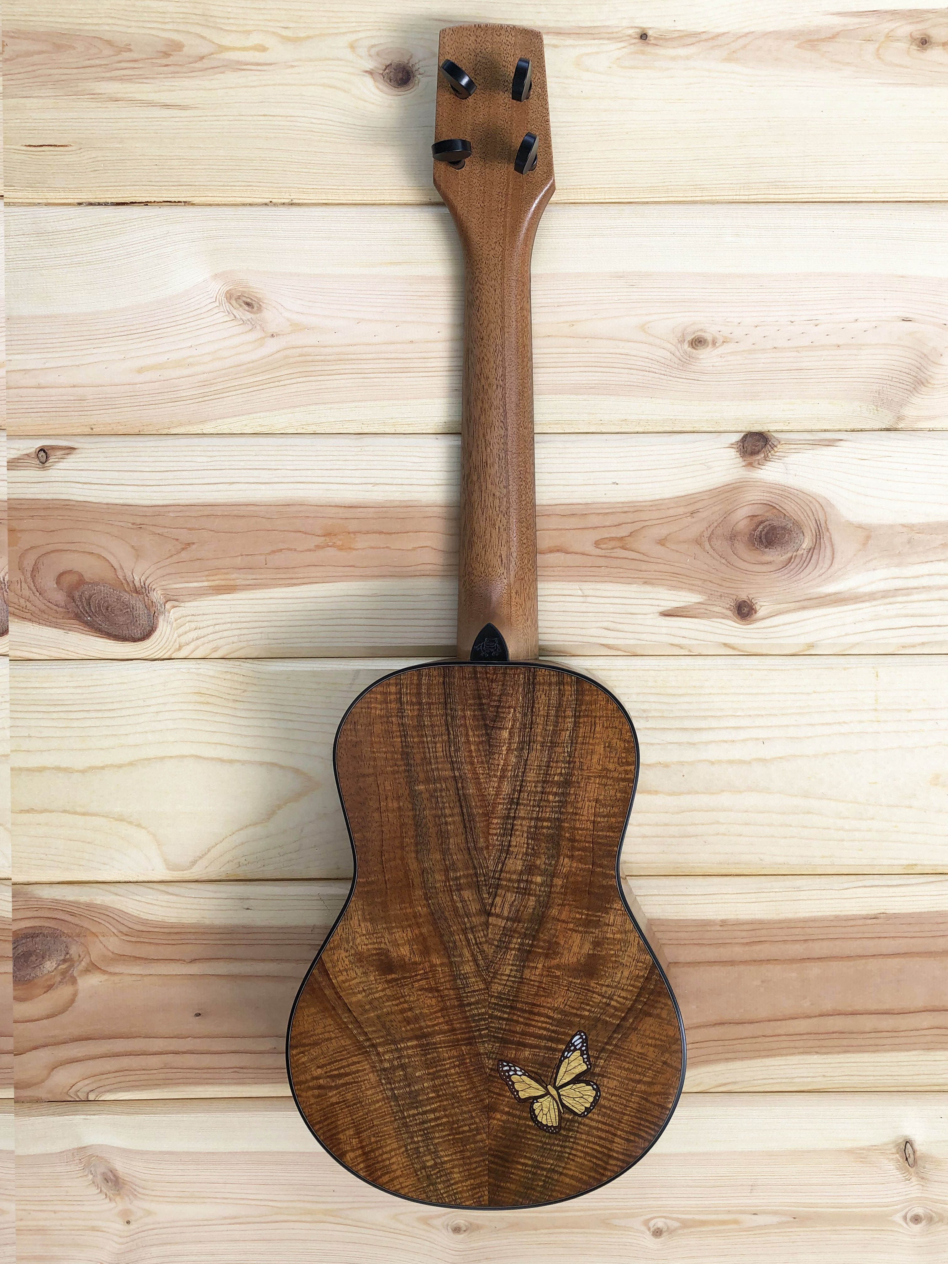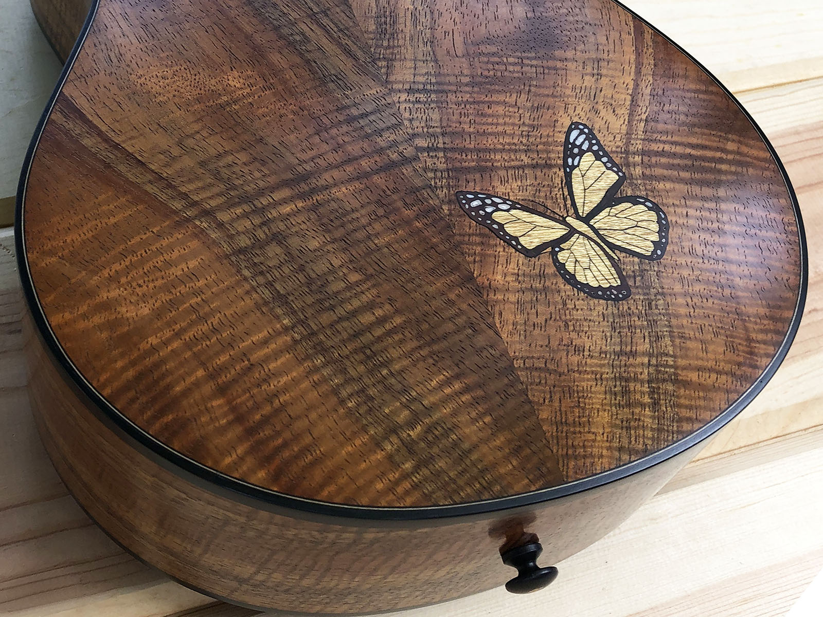 This was a fun project. Betty wanted a unique ukulele that would honor her family memories. We collaborated on a design with a dragonfly as a central element – simple details that would balance with the striking natural beauty of the Pale Moon Ebony. Dragonflies are Koa and Maple, adding subtle color elements.