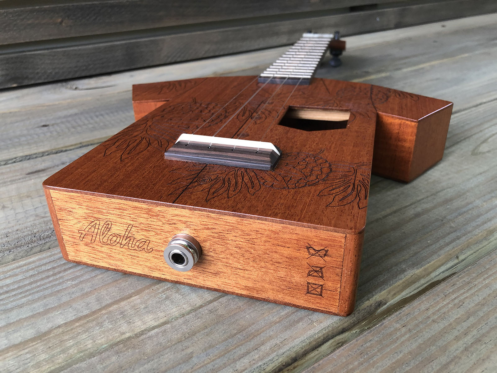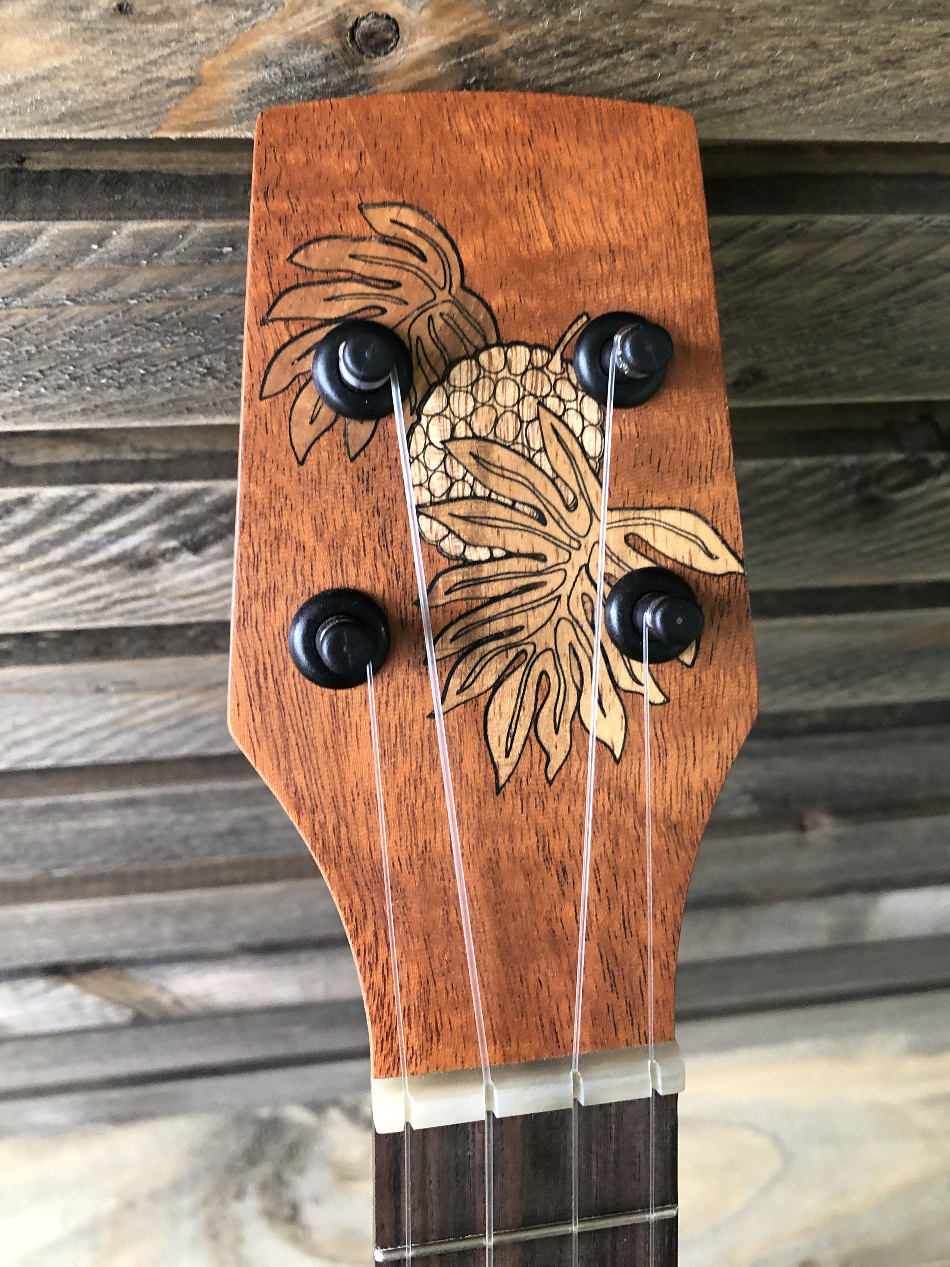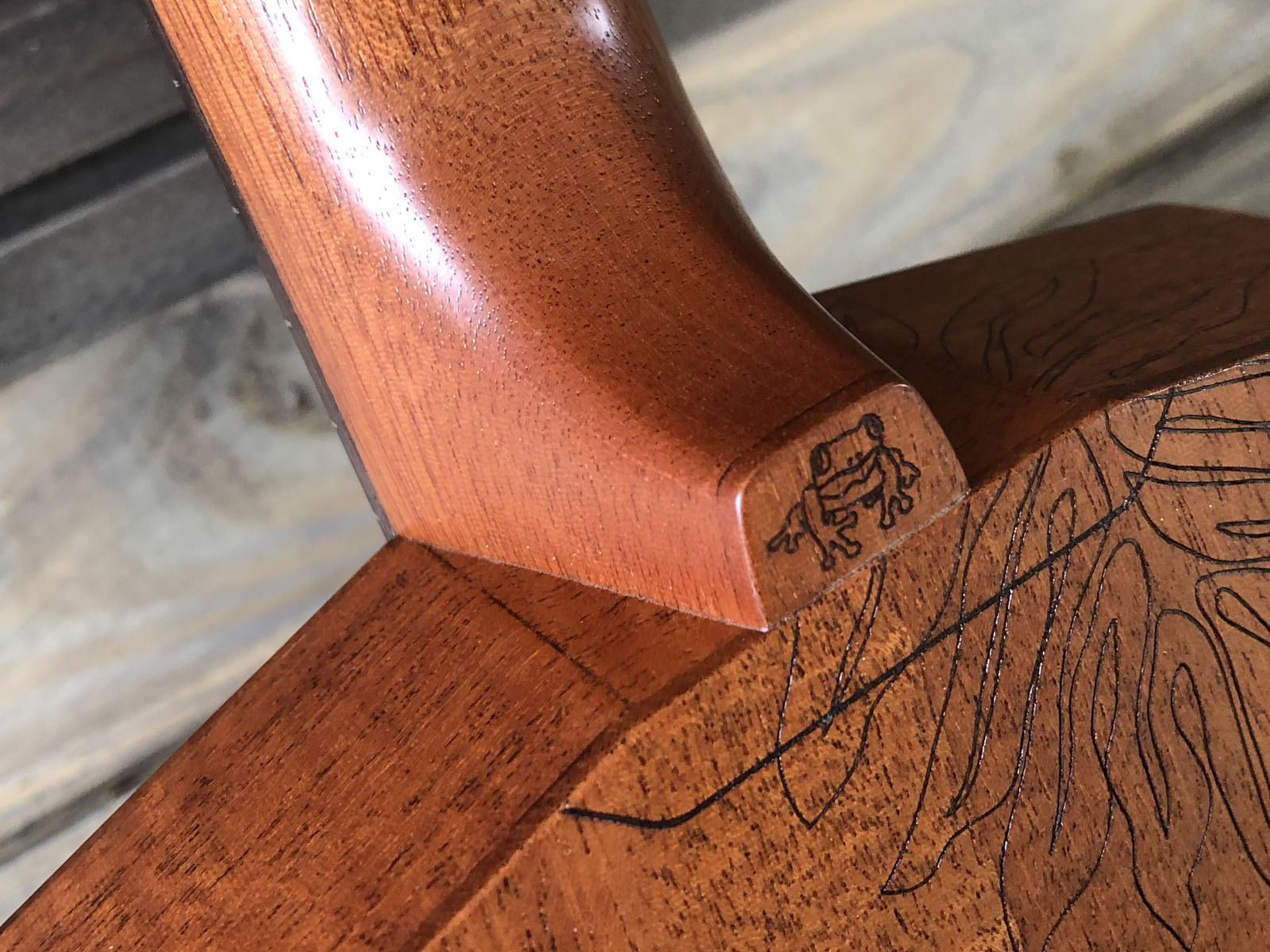 This was a fun project. Betty wanted a unique ukulele that would honor her family memories. We collaborated on a design with a dragonfly as a central element – simple details that would balance with the striking natural beauty of the Pale Moon Ebony. Dragonflies are Koa and Maple, adding subtle color elements.