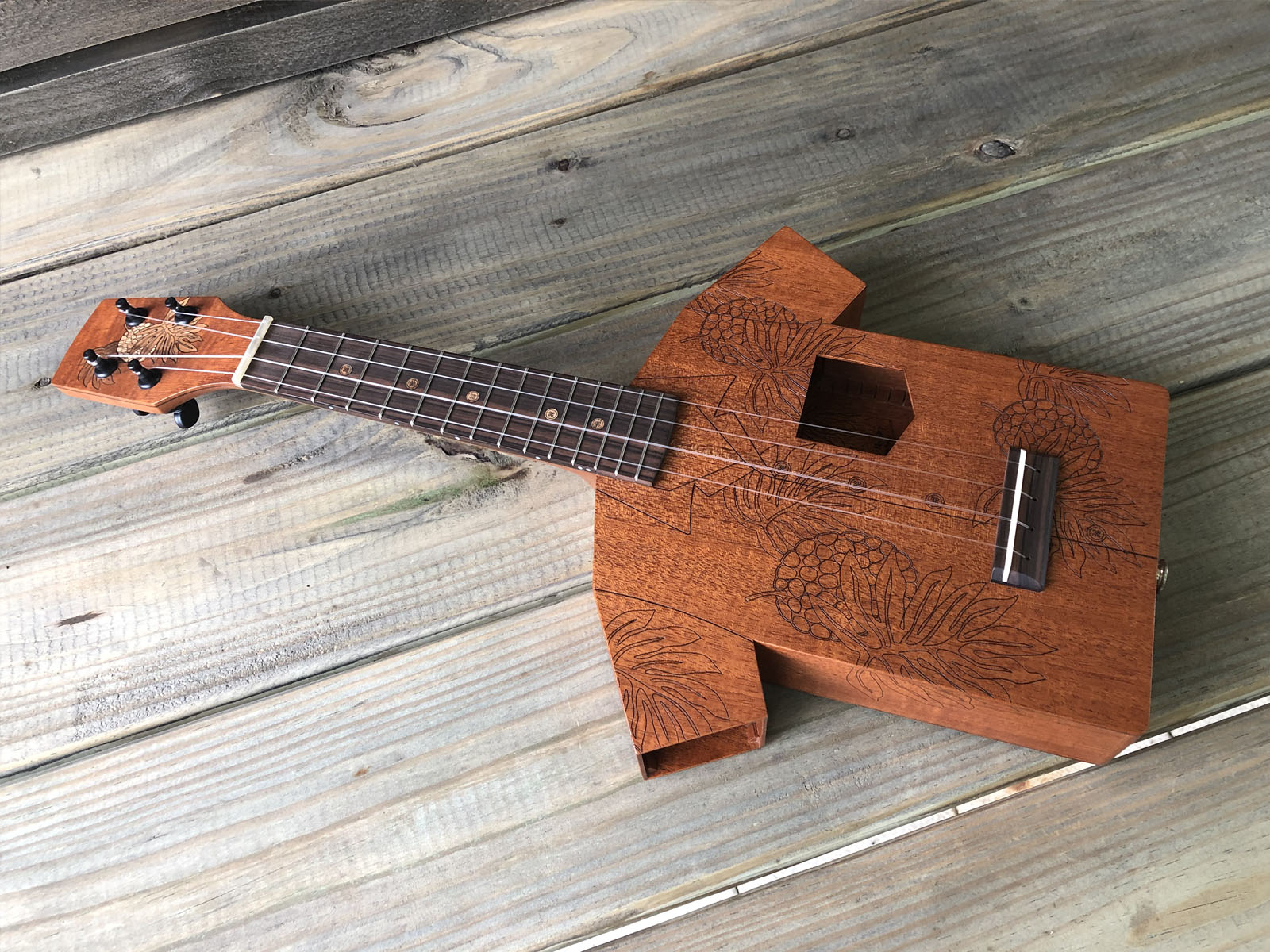 Named “Moonpie” by it’s owner, this concert ukulele features a Pale Moon Ebony body with custom inlaid details. Although not a common soundboard wood, this black & white ebony top gives a rich, resonate tone. Gabon Ebony rosette, headstock overlay, bindings, bridge, & fretboard add visual contrast to this unique instrument.